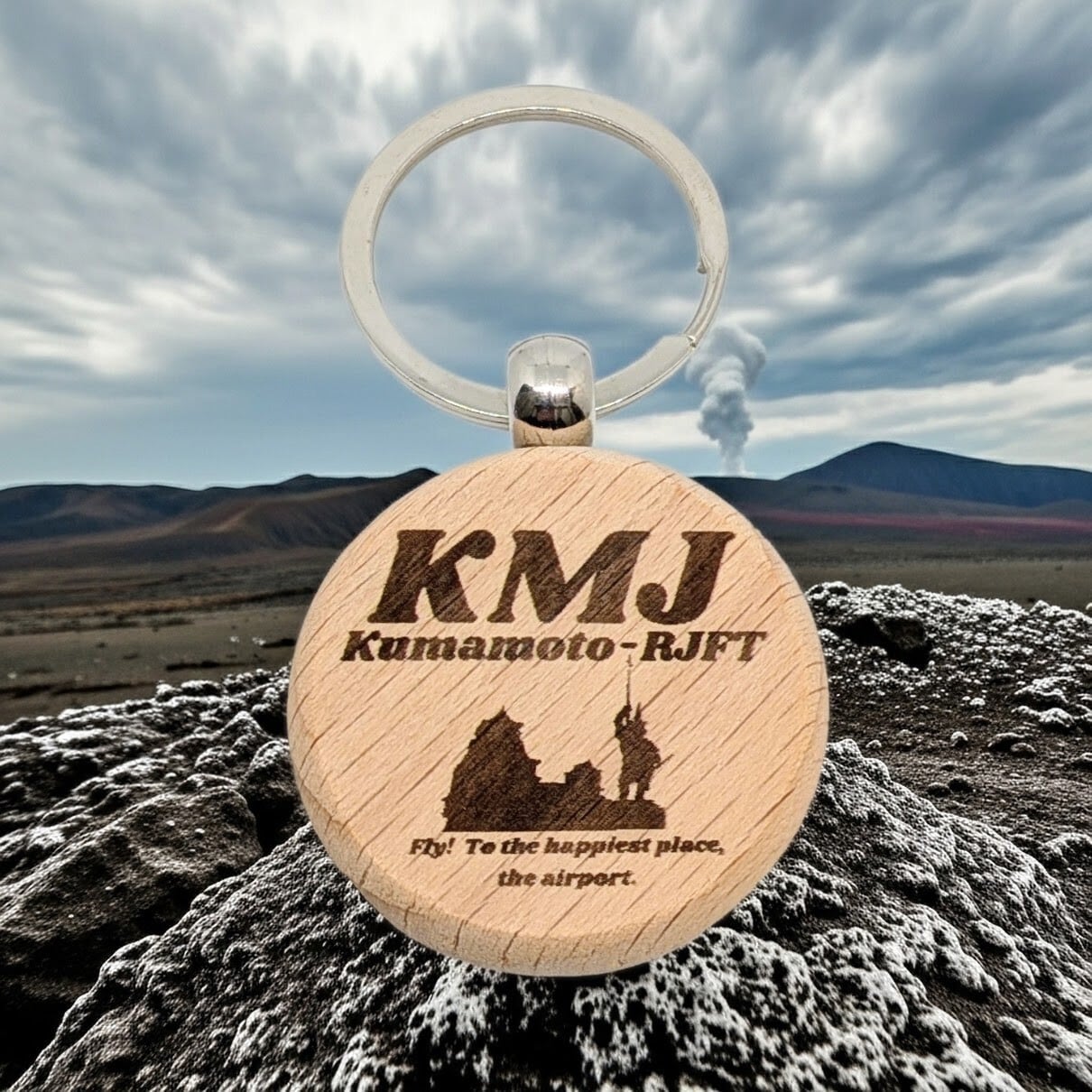 3レター・ご当地ステッカー【KMJ・熊本】のデザインを使用した、オリジナルのウッド・キーリングを作製しました!