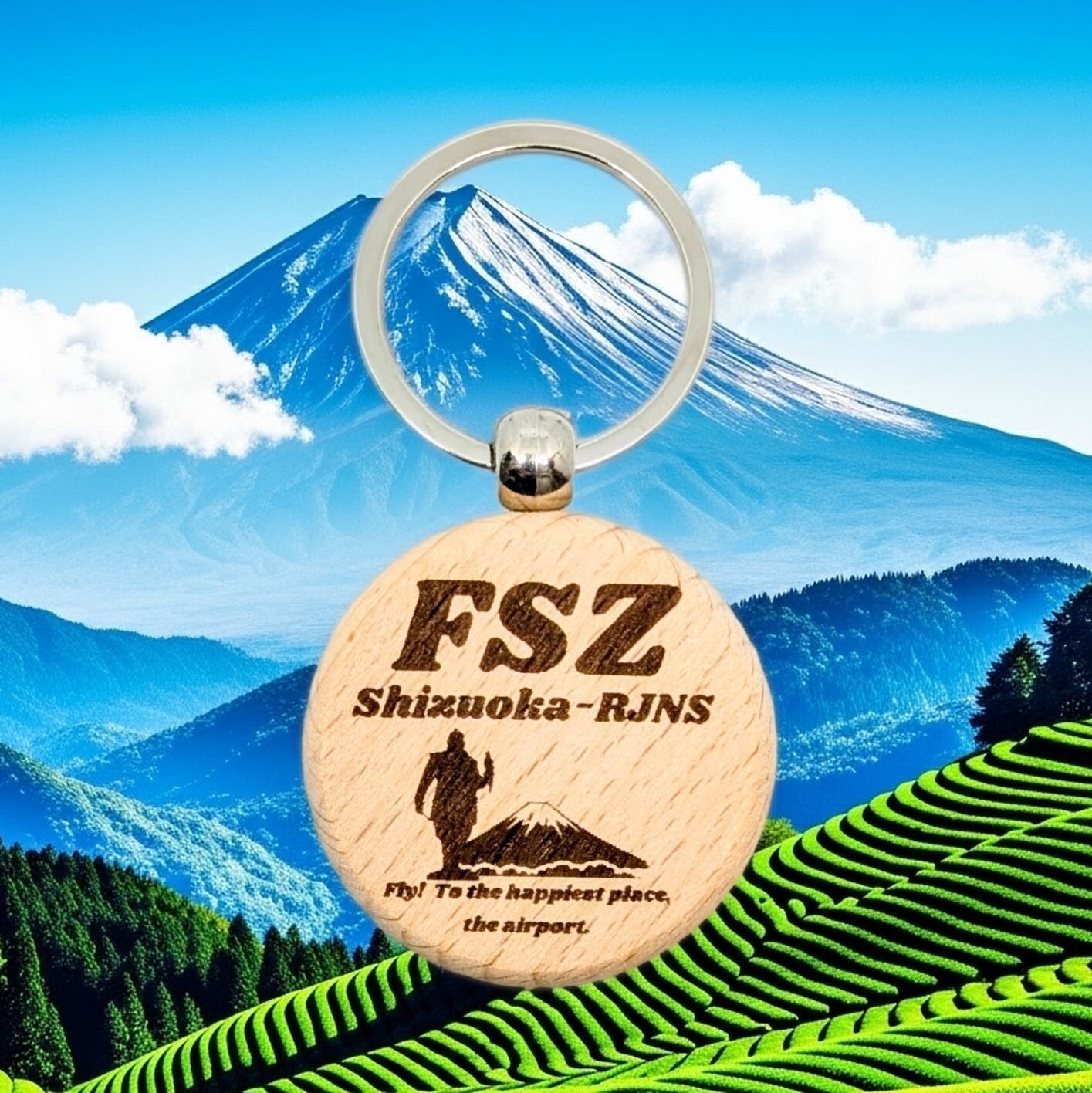 富士山静岡空港のIATA3レターコード「FSZ」を、温もりのある天然木に刻印したキリシマ飛行機オリジナルの木製キーリングができました。